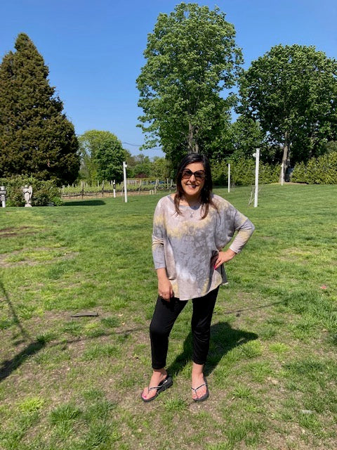 This tie-dye terry baggy top is a great addition to your casual wardrobe and it's On Sale!! It has a boxy fit with a rounded neckline. We are loving this top, had to buy one for myself! It is sooo comfy! Fabric: 63% Polyester, 34% Rayon, 3% Spandex