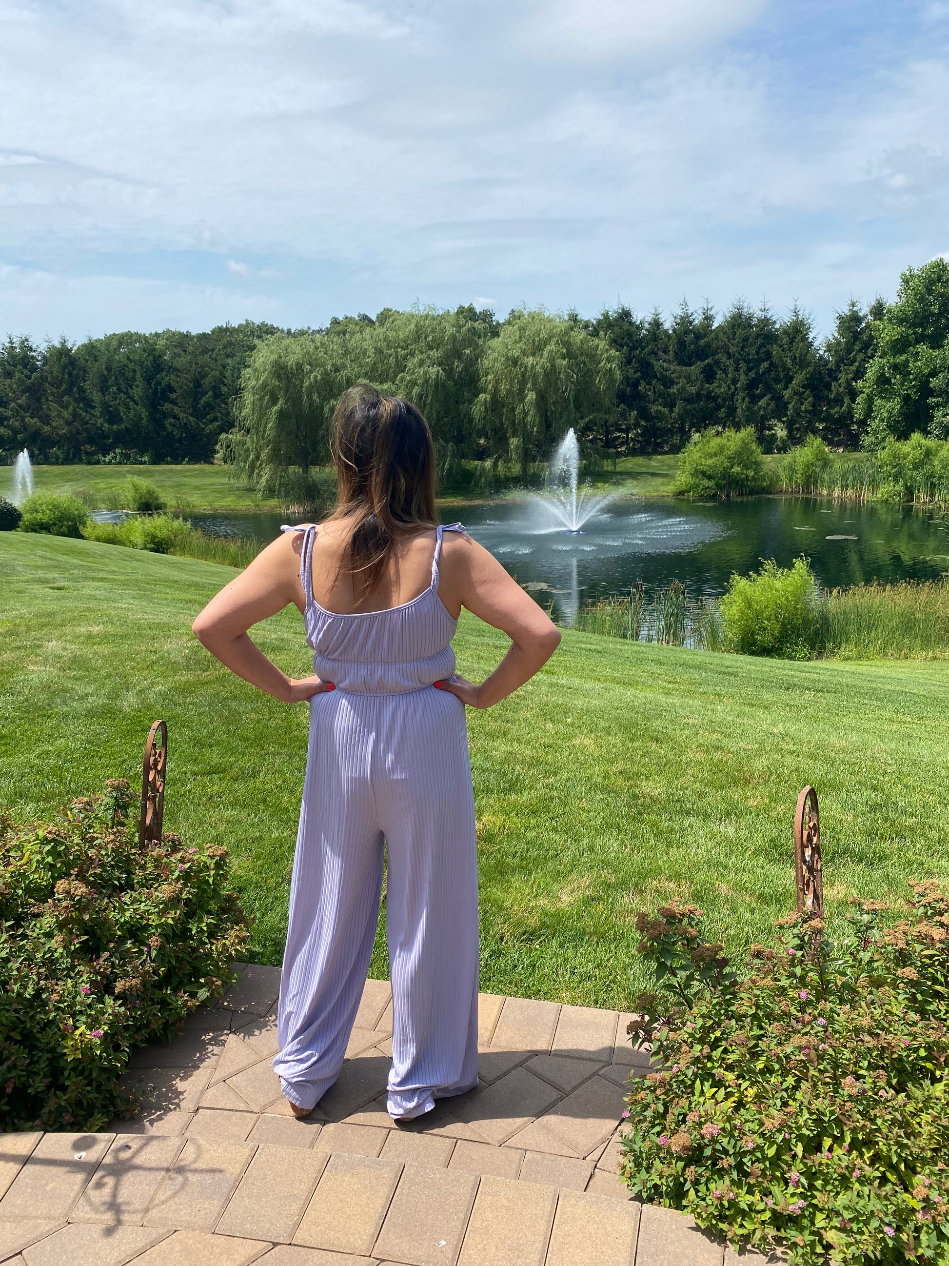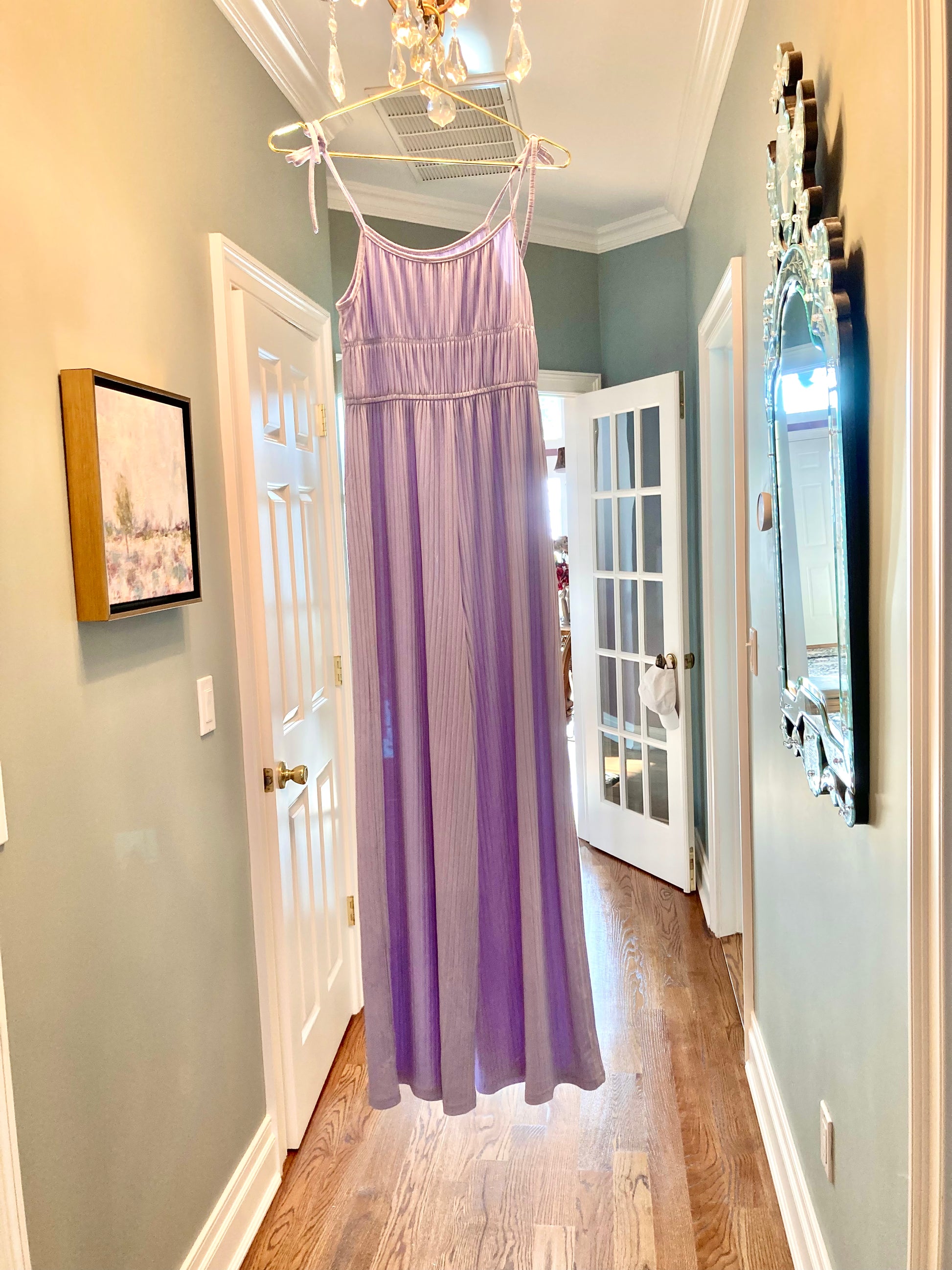 This one-piece outfit has adjustable bow tie straps with a double empire waist. The fabric is amazingly soft, lightweight, with a stretchy ribbed fabric. It is available in this beautiful soft lilac color offering a regular length. The color is a true lilac hue. Polyester fabric.