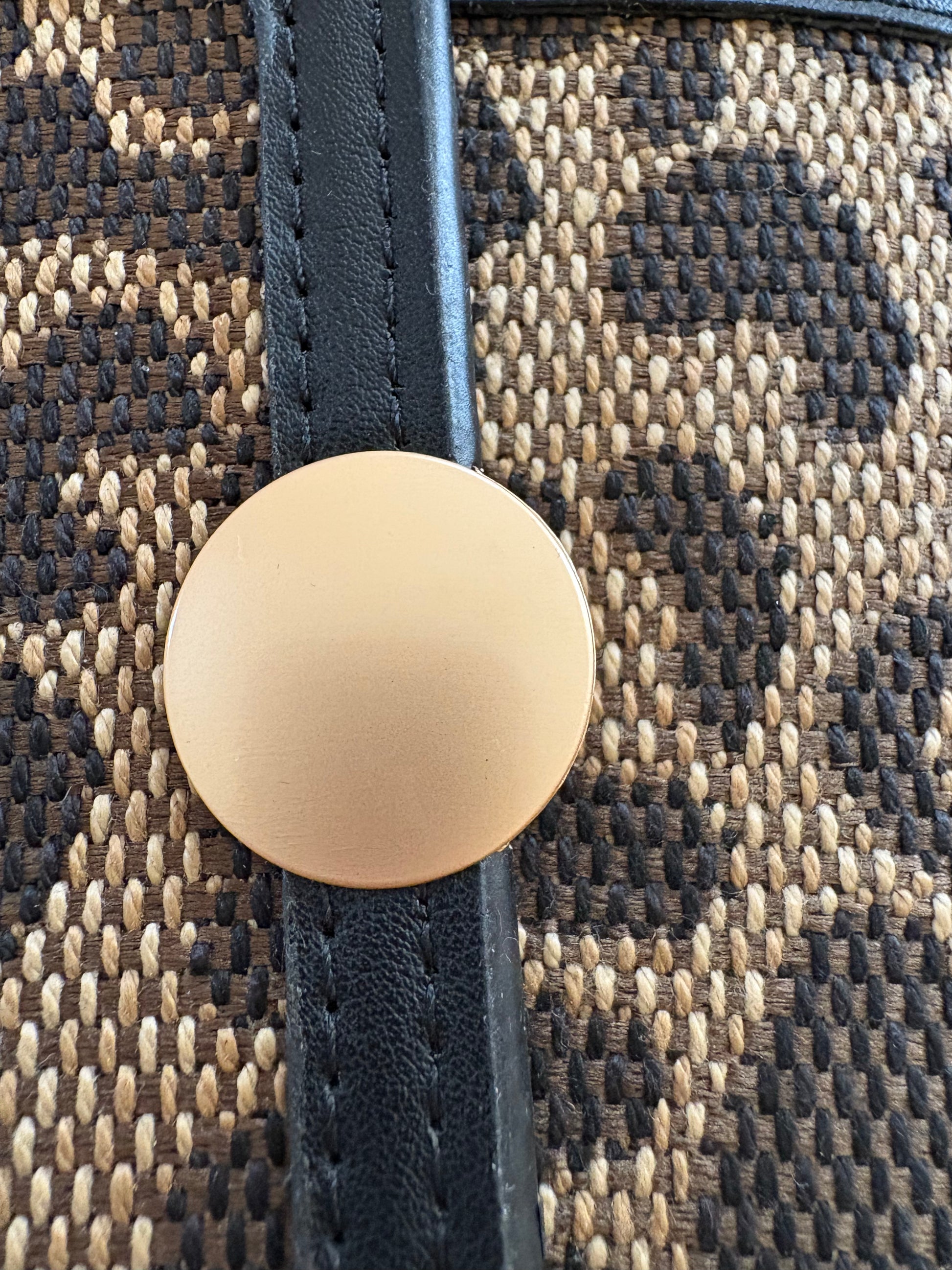 This trifold fabric tiger print wallet is in tones of brown and tan. It has a circular gold-tone disc snap closure. The dark brown stitched trimmed wallet opens to store your bills, ID, and credit cards.